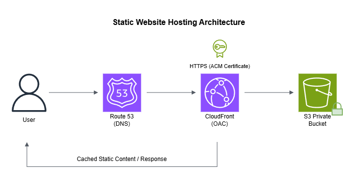 Technologies: S3, CloudFront, OAC, ACM, CloudFront Functions, Route 53